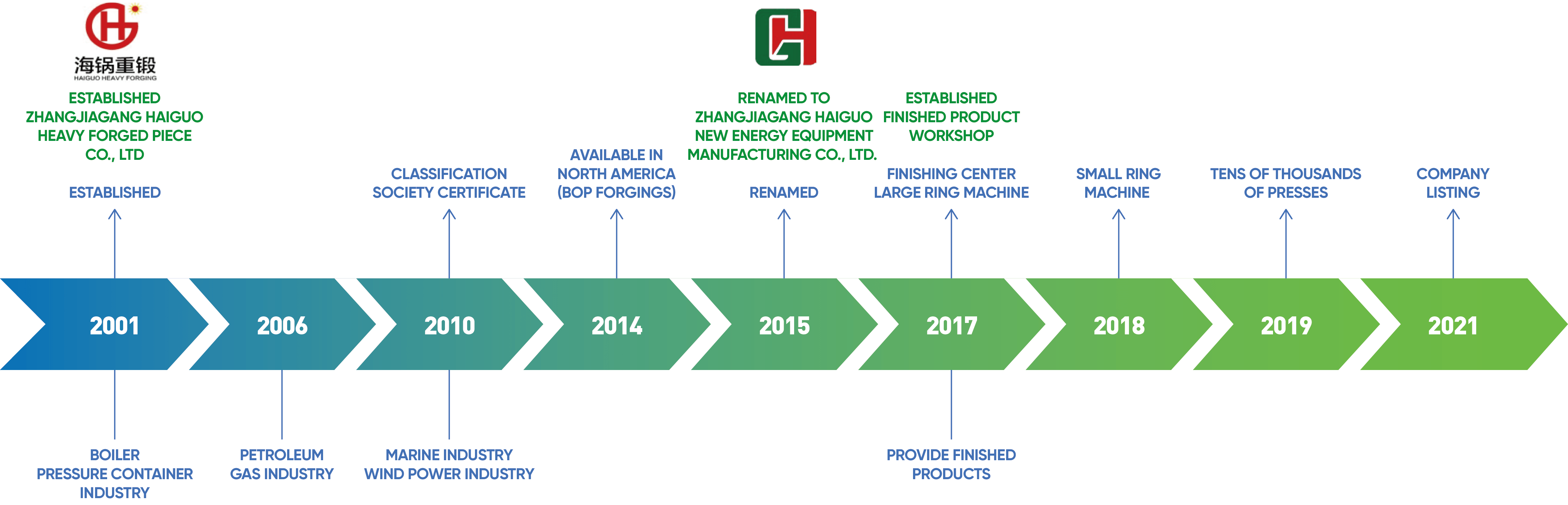 - Zhangjiagang Haiguo new energy equipment Co., Ltd. (stock abbreviation: Haiguo; Stock Code: 301063) was established in 2001 and successfully listed on the gem of Shenzhen Stock Exchange on September 24, 2021. The company is mainly engaged in the R & D, production and sales of special forgings for large and medium-sized equipment. Its products are widely used in oil and gas exploitation, wind power generation, mechanical equipment, ships, nuclear power and other fields, and provide customized forging products and parts with good comprehensive performance and stable quality for global equipment manufacturers.